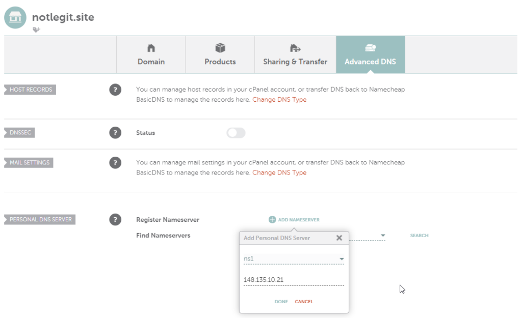 Head into the details of your domain and then click Advanced DNS. Scroll to the bottom of the page and click Add Nameserver.