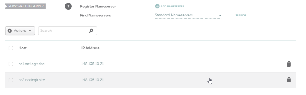 We’re going to create two Personal DNS servers, but they’re both going to point to the IP address of your server. We’ll create ns1 and ns2. If you want to check your work, click the search button and you should see both of your freshly created nameservers.
