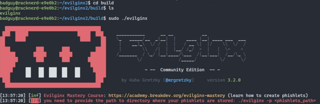 Time to retry executing our Evilginx proxy. Head back into the build folder for your installation and retry your command, however this time let’s tell it where the phishlets are located.